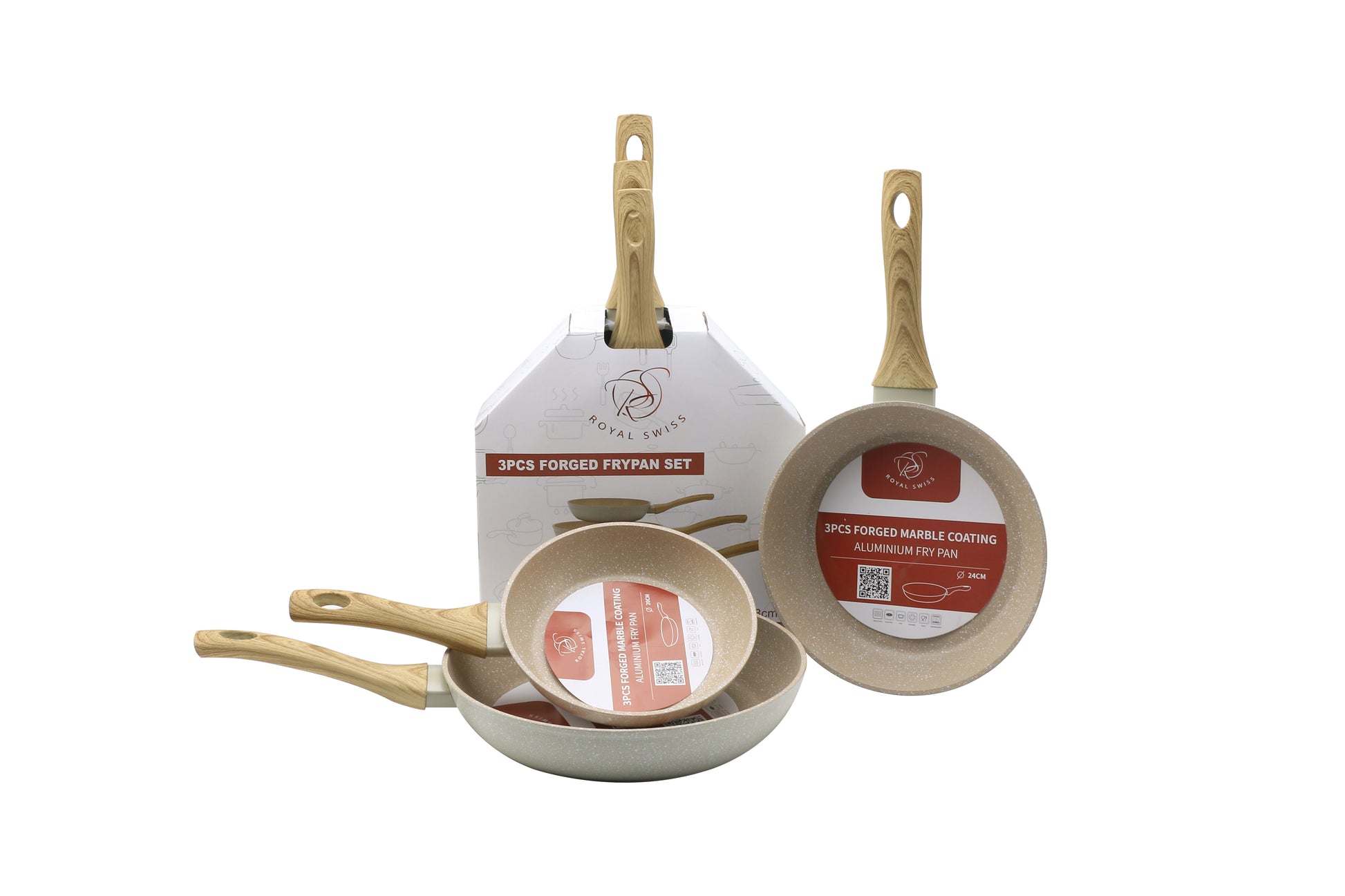 Chaque poêle est fabriquée avec un revêtement en pierre durable pour une excellente performance antiadhésive et un nettoyage facile, disponible en noir ou crème élégant. Les poêles sont équipées de poignées en bois , offrant une prise en main confortable et résistante à la chaleur et ajoutant une touche de sophistication.