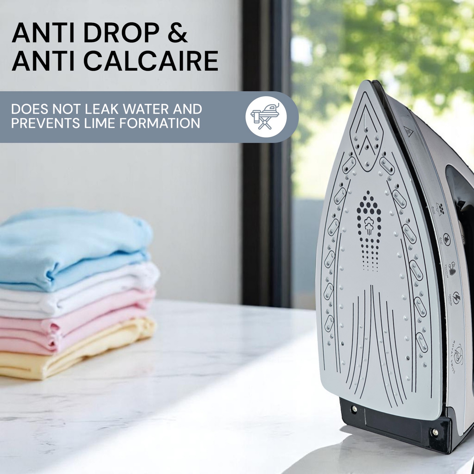 Le fer à repasser Royal Swiss avec console allie fonctionnalité et commodité, ce qui en fait le choix idéal pour une expérience de repassage fluide et organisée.