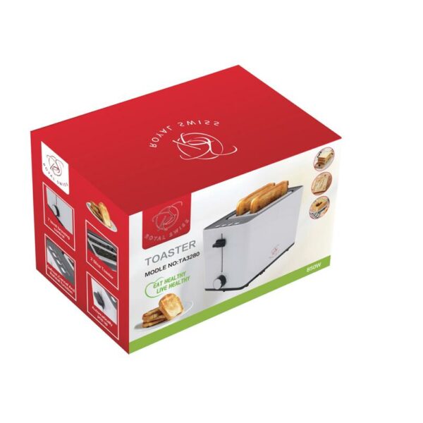Le grille-pain Royal Swiss White allie fonctionnalité et style contemporain, ce qui en fait un complément parfait à votre cuisine pour un grillage sans effort et uniforme.