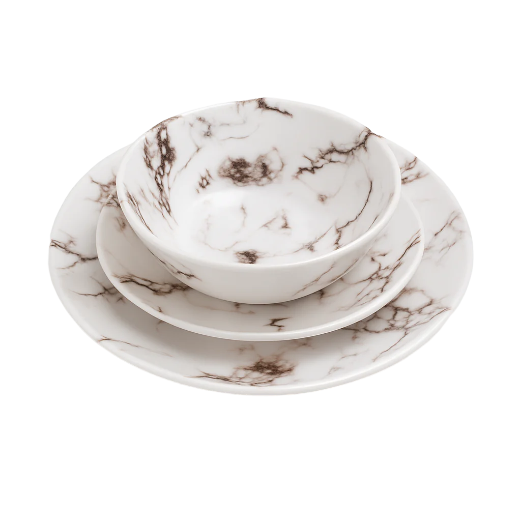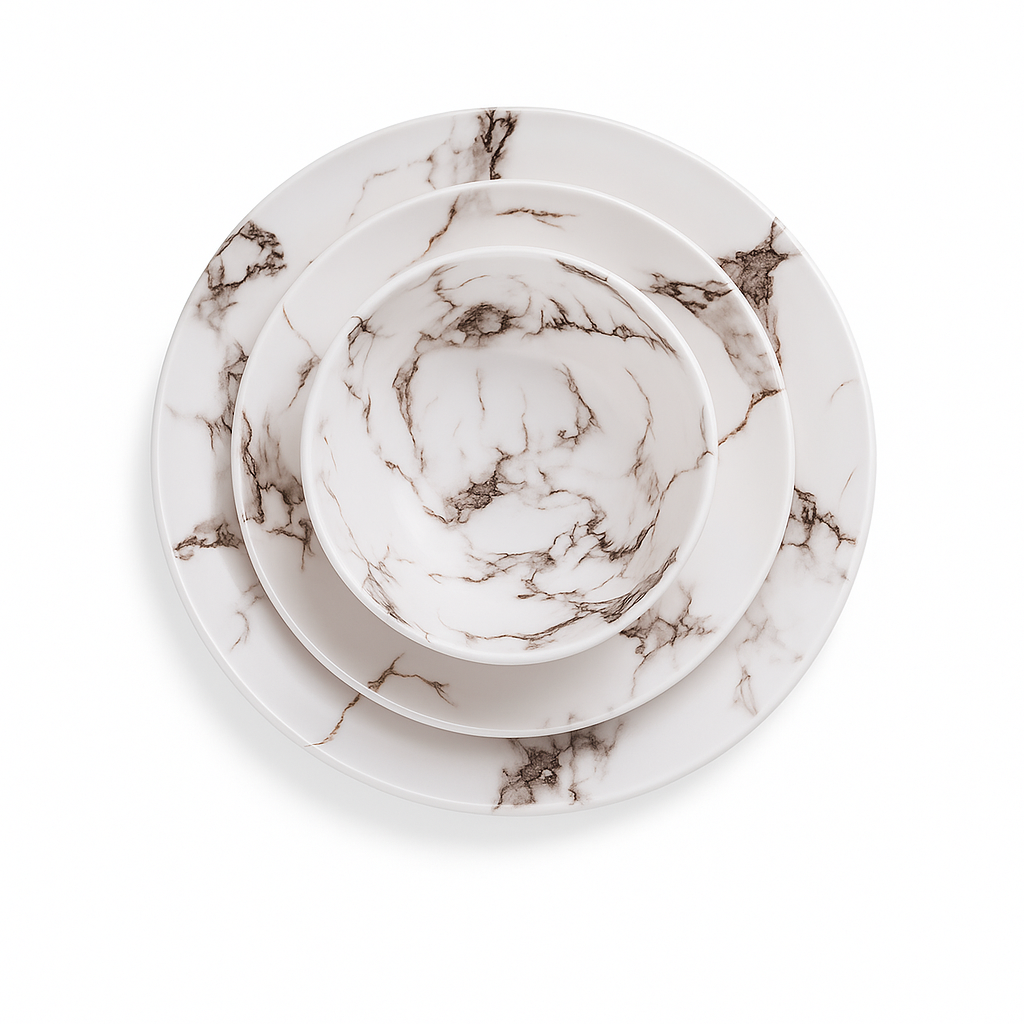 Elk stuk is met zorg vervaardigd om duurzaamheid, dagelijks gebruik en visuele aantrekkingskracht te garanderen. De strakke lijnen en gladde afwerking versterken uw presentatie, terwijl het bijpassende marmeren design een vleugje luxe toevoegt aan elke maaltijd – of u nu geniet van een rustig diner voor twee of weekendgasten ontvangt.