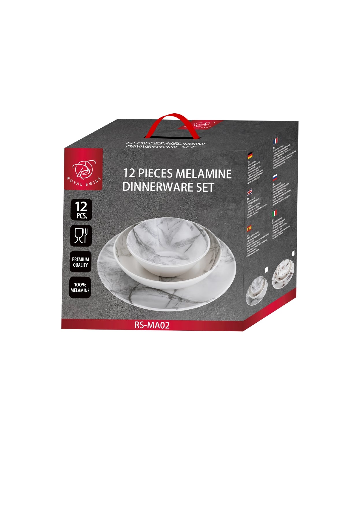Verfijn uw dagelijkse maaltijden en speciale diners met de Royal Swiss 12-delige marmeren serviesset , een compacte en stijlvolle collectie, ontworpen voor elegante diners met vier personen . Met een verfijnd wit marmerpatroon met opvallende zwarte accenten brengt deze set tijdloze charme en moderne verfijning naar uw tafel.
