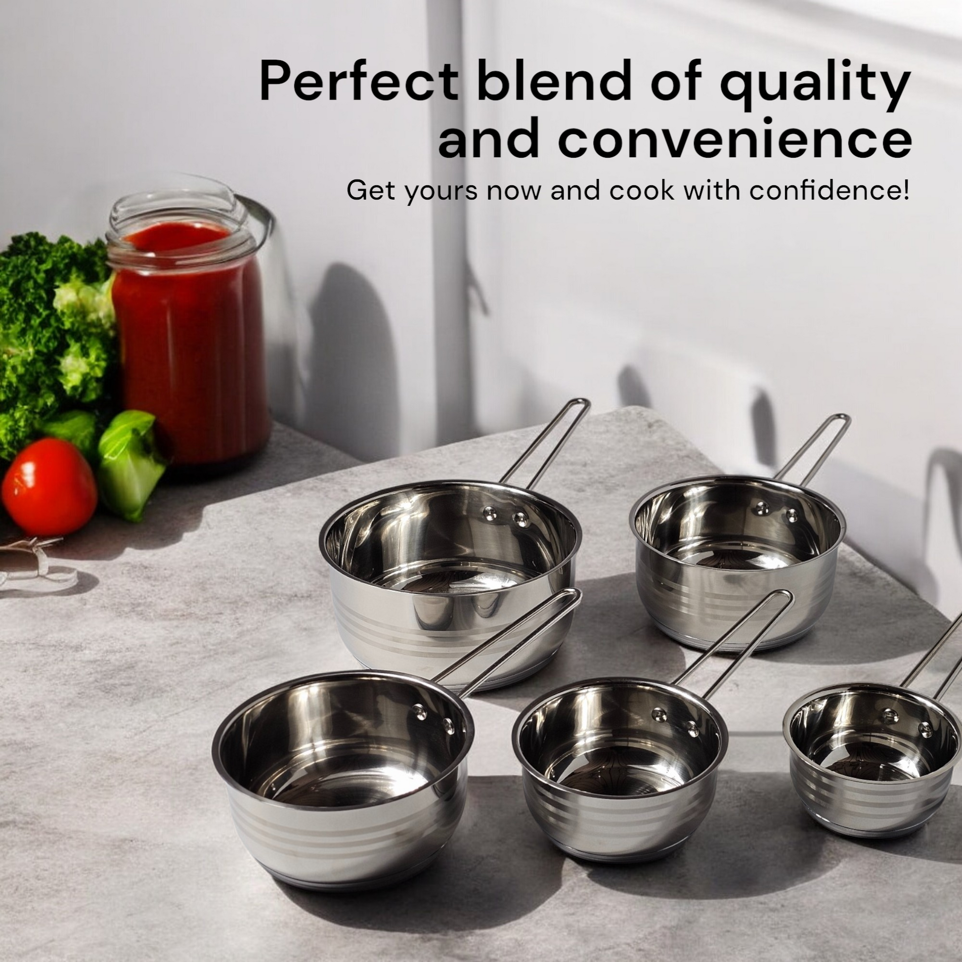 - 5 roestvrijstalen steelpannen in verschillende maten, perfect voor alles van sauzen en soepen tot kleine bijgerechten en het opwarmen van restjes.